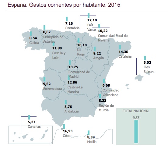 Nos gastos correntes por habitante a provincia da Coruña destaca tamén por riba, mentras as outras tres están por baixo.