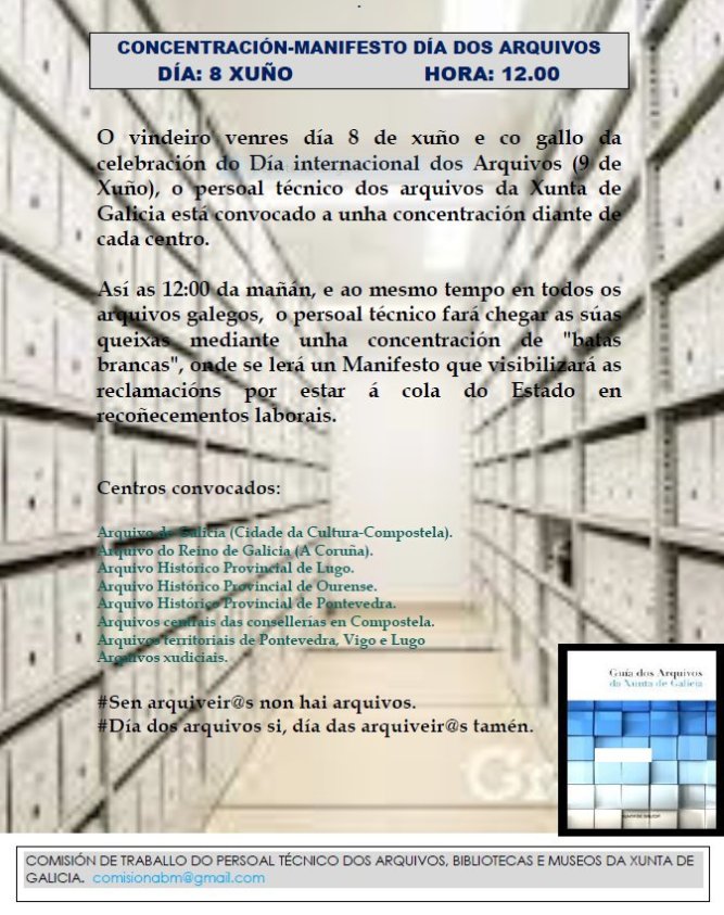 Os arquivos de administración autonómica están chamados a realizar unha acción reivindicativa ante a situacións do persoal convocada pola APTAX (Asociación Profesional de Arquiveir@s da Xunta de Galicia) que se realizará o día 8 ás 12h. diante dos arquivos no que se lerá un manifesto reivindicativo.
