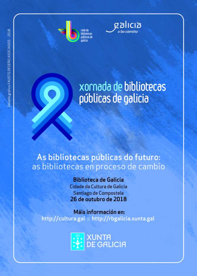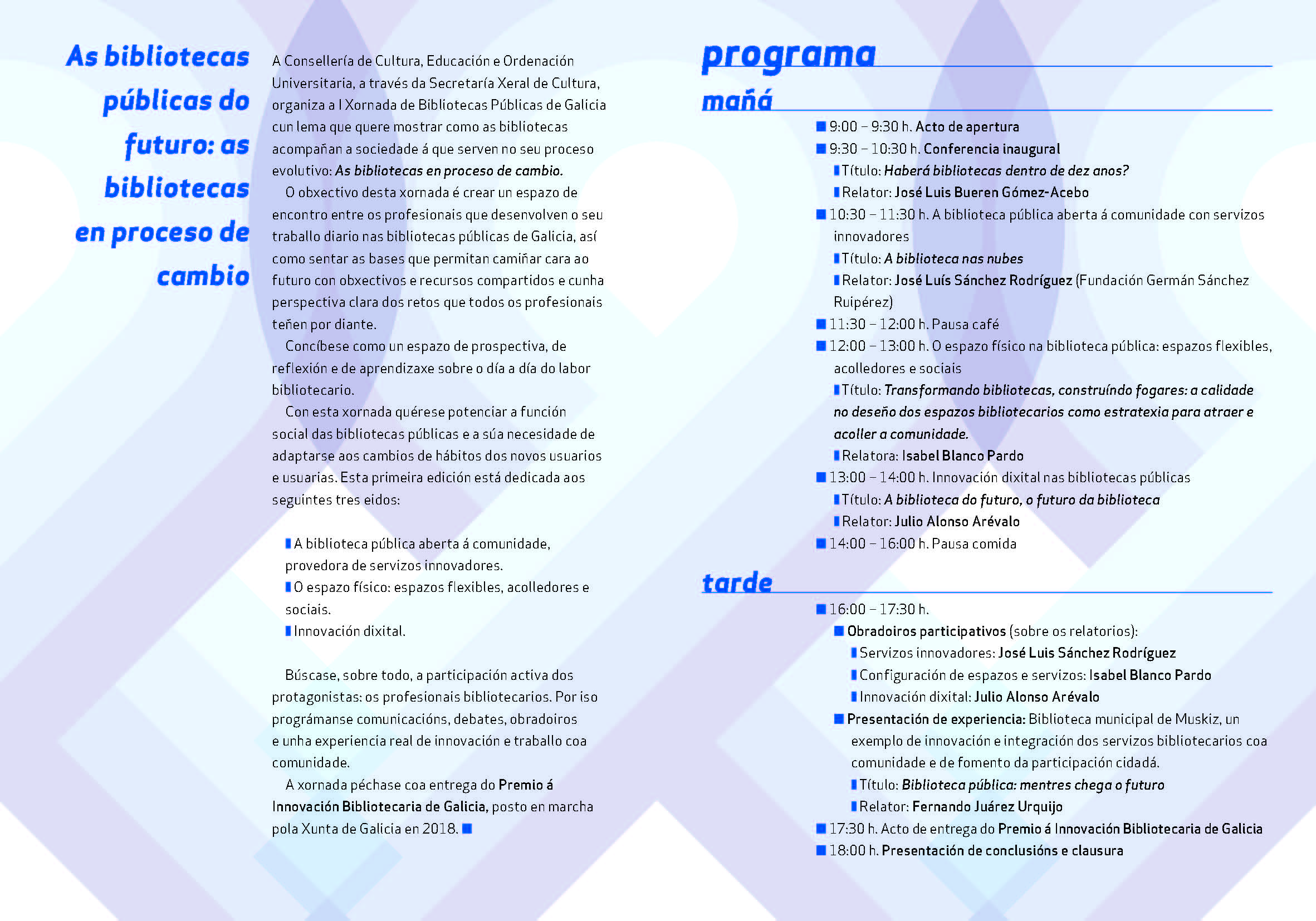 O 26 de outubro a Consellaría de Cultura, Educación e Ordenación Universitaria a través do Servizo de Bibliotecas, organiza a I Xornada de Bibliotecas Públicas de Galicia, que baixo o lema As bibliotecas públicas do futuro: as bibliotecas en proceso de cambio, celebrarase o venres 26 de outubro no Auditorio Neira Vilas da Biblioteca e Arquivo de Galicia. O director técnico da Biblioteca Nacional de España (BNE), José Luis Bueren Gómez-Acebo, será o encargado de pronunciar a conferencia inaugural. O encontro contará coa participación de expertos de recoñecido prestixio no ámbito bibliotecario e coa presentación de experiencias innovadoras e boas prácticas para compartir cos profesionais asistentes.