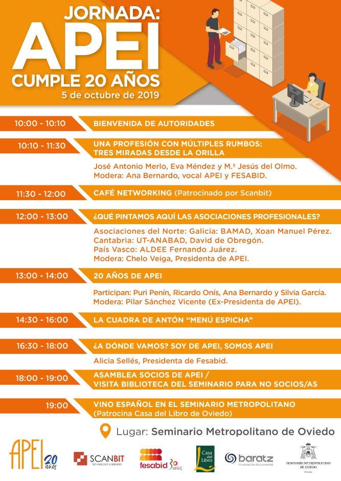 Con motivo da celebración do seu aniversario organizan as xornadas 20 años APEI o sábado 5 de outubro en Oviedo, na que convidaron a asistir a varias asociacións, entre elas Bamad Galicia, que participará nunha mesa redonda que versará sobre o asociacionismo profesional. Ademais de mesas redondas haberá unha actividade formativa sobre o fortalecemento das asociacións a cargo de Alicia Sellés, presidenta de Fesabid. E contará tamén coa participación de destacados profesionais da documentación e información como José Antonio Merlo, Eva Méndez ou María Jesús del Olmo.
