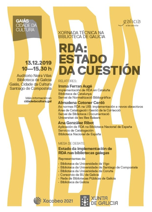 Baixo o título “RDA: estado da cuestión”, a xornada o terá lugar o día 13 de decembro no Auditorio Xosé Neira Vilas da Biblioteca de Galicia. O horario será de mañá, entre as 10:00 e as 15:30 horas, cun descanso entre intervencións para una café ás 11:30 h. Ao remate da xornada servirase unha comida lixeira na Sala Eisenman.
