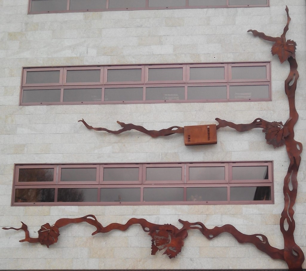 Si! O edificio inicialmente non contaba con este elemento, e dende a concellería de Cultura pensouse que sería boa idea darlle un pouco de visibilidade ao edificio bibliotecario, e no ano 2020, decidiuse instalar un elemento decorativo na fachada. Foi ideada por un arquitecto local, Roi Domínguez. Nela pódese ver unha parra de uva, en referencia a importancia do viño nesta zona, ademais de que Florencio Delgado tamén tratou este tema nos seus escritos. Por suposto, o autor está presente!