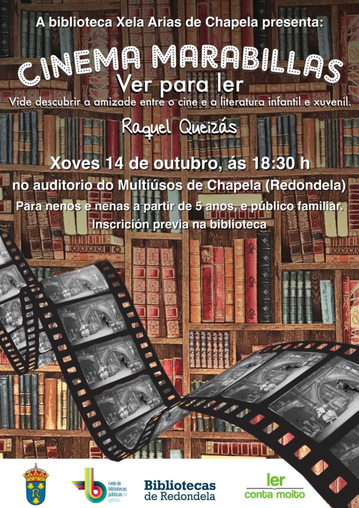 - Xoves 14 de outubro: Nas bibliotecas municipais de Redondela festexamos o Día das bibliotecas achegando cinema e literatura, co espectáculo familiar: “Cinema marabillas”, da contadora e actriz Raquel Queizás, ás 18:30h., no auditorio do Multiúsos de Chapela