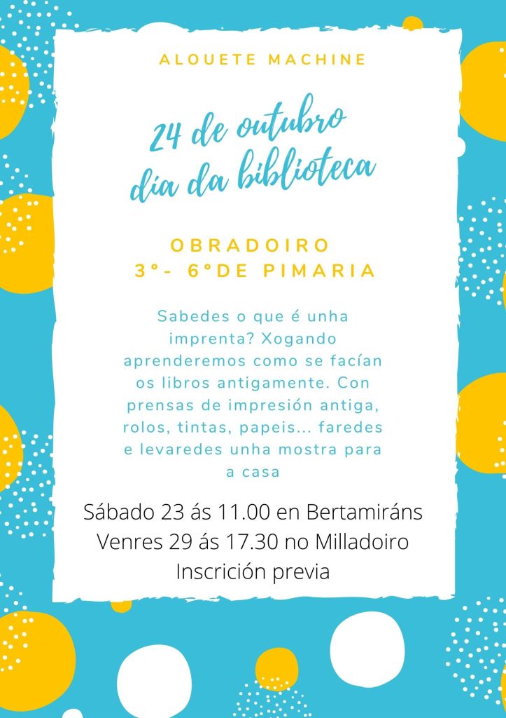 - Venres 22 de outubro: Imprenta creativa: Obradoiro de escritura de postais con tipografía e outras técnicas de estampación. Impartido por Alouette Machine. Nenos e nenas de 6 a 10 anos. De 18:30 a 20h.