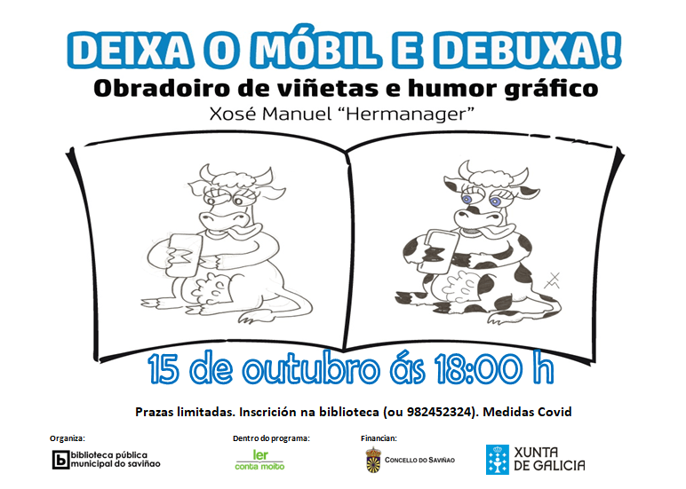 - Venres 15 de outubro: Deixa o móbil e debuxa: obradoiro de viñetas e humor gráfico con Xosé Manuel Hermanager, iniciación á ilustración e banda deseñada, ás 16h.