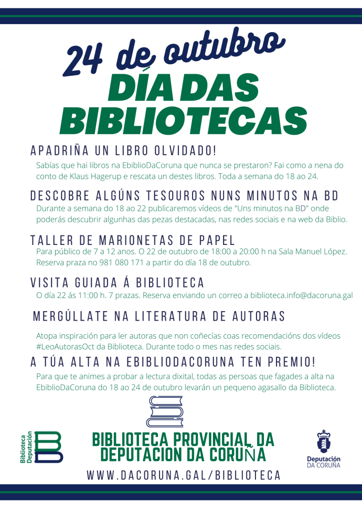 - Durante todo o mes: Mergúllate na literatura de autoras: publicamos todos os días un fragmento dunha obra dunha escritora nas redes sociais da Biblioteca, co cancelo #LeoAutorasOct. Atopa inspiración e proba literatura que non coñecías.