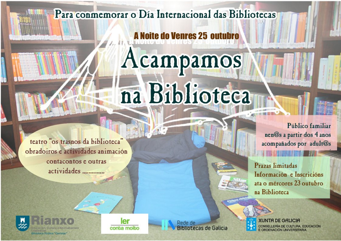 Outra que está no caixón, pero que tivo unha andadura, foi Acampamos na Biblioteca conmemorando o Día das Bibliotecas. O evento comezaba pola tarde, celebrándose actividades, e alongábase ata a mañá seguinte, tras un almorzo con visita sorpresa; algunha das figuras que nos acompañaron foi Helena Villar Janeiro. Lamentablemente esta actividade cesou pola pandemia, polo que aínda non se retomou.