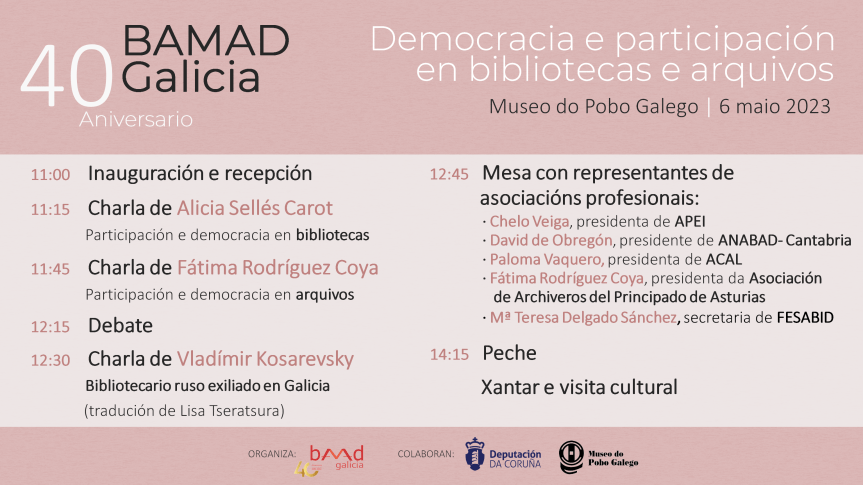 O Encontro titularase. Democracia e Participación en Bibliotecas e Arquivos, 40 anos de BAMAD-Galicia