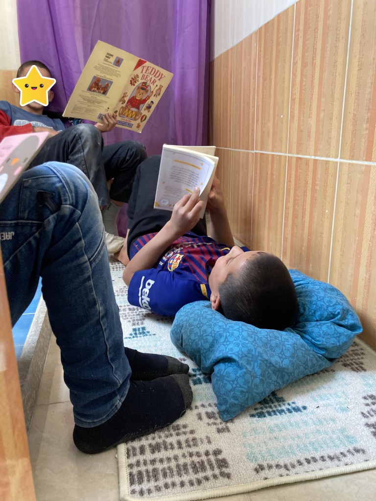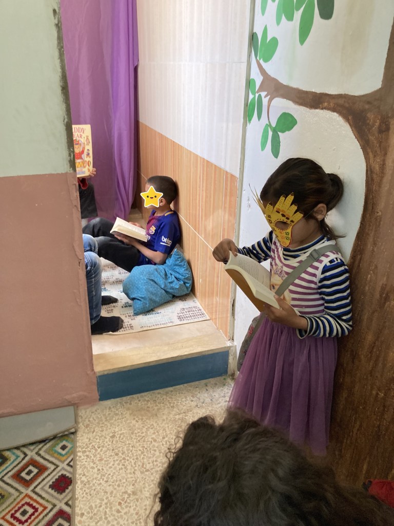 Ata principios de novembro a biblioteca estivo dispoñible para o noso alumnado durante os recreos e para todo o público dúas tardes á semana. Sen embargo, dende ese mes a arrendadora obrigounos a mudarnos e as nosas salas de lectura desapareceron. Agora instalamos un rincón de biblioteca na entrada da nova escola e ao longo dos recreos o alumnado colle os libros e desfruta de momentos de tranquilidade. Este espazo favorece especialmente ao estudantado que ven á escola pero amosa dificultades para incorporarse ás aulas e seguir o ritmo das clases. Acudir á biblioteca para mirar tranquilamente os libros ilustrados e calmarse antes de volver á aula é algo necesario para moita do alumnado que está habituado a vivir nun ambiente de conflito e supervivencia. Eses momentos de calma nos que poder contemplar en silencio os libros ou mergullarse na lectura a soas tamén son apreciados polo noso alumnado xa que iso é algo inexistente no seu fogar, as tendas de campaña. Por iso, a nosa escola tamén serve como espazo de calma e relaxación, non só como unha instalación na que se imparten clases, e o rincón dos libros desempeña un papel crucial neste sentido.