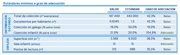 - Tamén sinala o déficit no número de postos de lectura, que como sinalamos máis arriba non son postos en salas de estudo, senón postos de lectura vinculados á biblioteca, estando dotada só do 35% dos postos que a cidade debería ter.