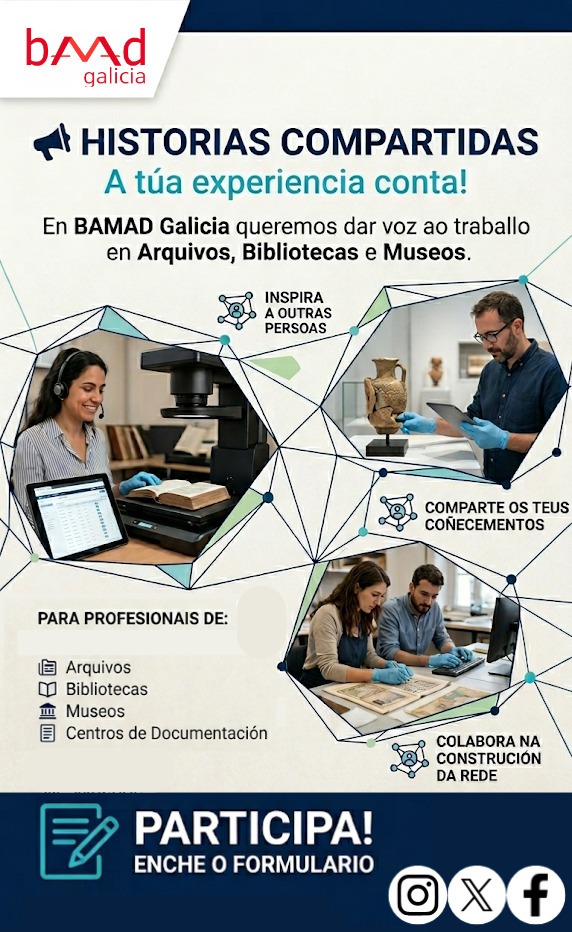 En BAMAD Galicia queremos coñecer os proxectos e iniciativas que se están a levar a cabo en arquivos, bibliotecas, museos e centros de información e documentación e divulgalas para que poidan servir de inspiración a outras persoas profesionais do sector.